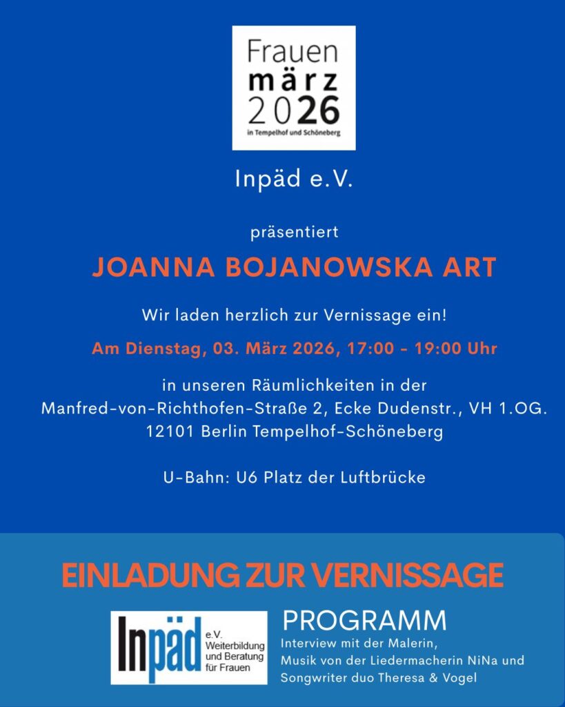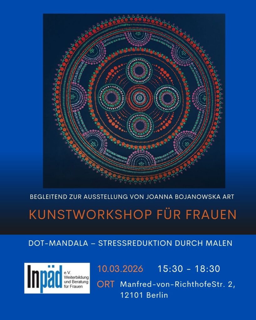 Begleitend zur Ausstellung bietet die Künstlerin am Dienstag, 10. März 2026 von 15.30 – 18.30 Uhr einen Kunstworkshop für Frauen an.