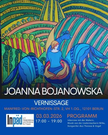 Mit ausdrucksstarken Farben und intensiven Emotionen gibt die Ausstellung Einblick in die Lebenswelt einer Frau, die in Berlin zu Hause ist. Die polnische Künstlerin nimmt die Besucher*innen mit auf eine Reise durch ihre innere Gefühlslandschaft und erzählt von Frauen, die sich selbst empowern, zwischen gesellschaftlichen Erwartungen und eigenen Träumen navigieren und unsichtbare Grenzen überwinden. Die Werke lassen Raum für eigene Interpretationen, laden zum Innehalten ein und entfalten ihre Bedeutung oft erst beim zweiten Blick. Sie regen dazu an, die dargestellten Erfahrungen mit der eigenen Lebensrealität zu verbinden und persönliche Grenzen zu erkennen, zu hinterfragen und mutig zu überschreiten.