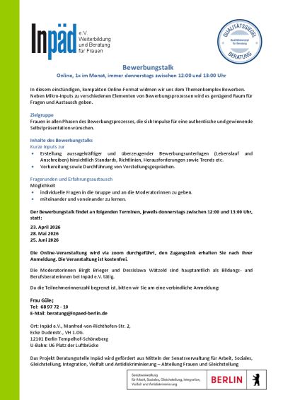 Neben Mikro-Inputs zu verschiedenen Elementen von Bewerbungsprozessen wird es genügend Raum für Fragen und Austausch geben.