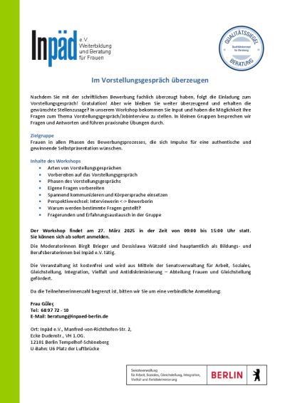 Nachdem Sie mit der schriftlichen Bewerbung fachlich überzeugt haben, folgt die Einladung zum Vorstellungsgespräch! Gratulation! Aber wie bleiben Sie weiter überzeugend und erhalten die gewünschte Stellenzusage? In unserem Workshop bekommen Sie Input und haben die Möglichkeit Ihre Fragen zum Thema Vorstellungsgespräch/Jobinterview zu stellen. In kleinen Gruppen besprechen wir Fragen und Antworten und führen praxisnahe Übungen durch.