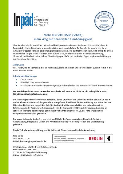 Vier Stunden, die Ihr Verhältnis zu Geld nachhaltig verändern können: In diesem Präsenz-Workshop für Frauen in Berlin verbinden wir praxisnahes Wissen mit persönlichem Austausch. Sie lernen, wie Sie im Alltag clever sparen können, eine Finanzplanung entwickeln, die zu Ihrem Leben passt, und mutig die ersten Investitionen tätigen – weil Finanzen nicht nur mit Geld, sondern vor allem mit Selbstbestimmung, Sicherheit und Freiheit zu tun haben. Ohne Fachjargon, dafür mit konkreten Tipps, inspirierende Übungen zur Erreichung Ihrer Ziele.